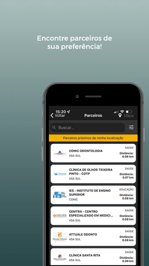 Busca de parceiros através do geolocalizador, filtragem personalizada para as buscas de empresas parceiras, acesso ao cartão virtual para utilizar os descontos, acesso a notícias e além do SAC para atendimento.