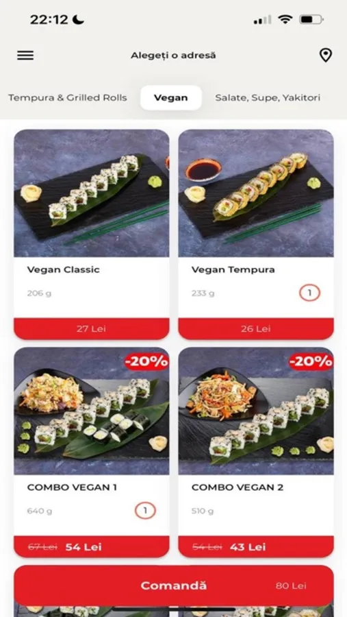 Selectați o categorie de preparate și adăugați felul de mâncare în coș