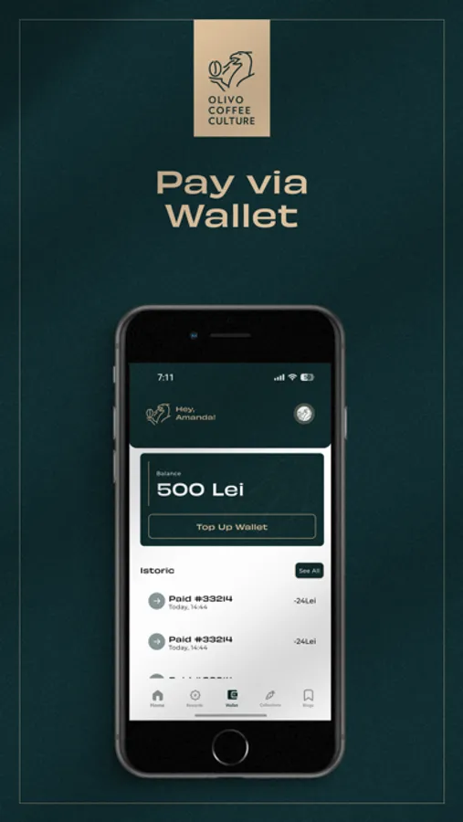 Adaugă soldul pe care ți-l dorești în aplicația Olivo Coffee folosind funcția Wallet pentru și ai cashback în funcție de fiecare prag al soldului încărcat.
