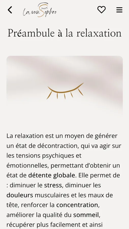 La Voix Sophro est une application de sophrologie. Bénéficiez de programmes par thèmes ou par techniques, complétés régulièrement par de nouveaux entraînements. Devenez acteur de votre bien-être où vous voulez et quand vous voulez. Vous pourrez souscrire à un abonnement mensuel permettant de débloquer un accès illimité à l'application.
