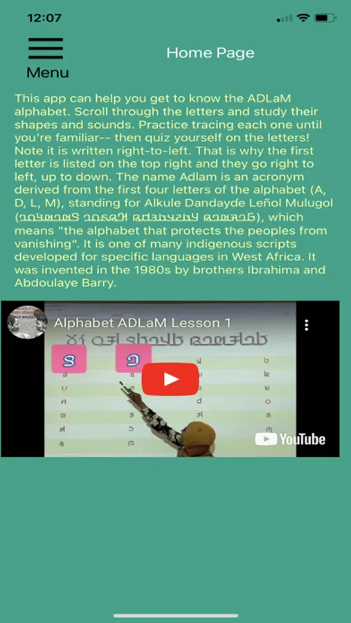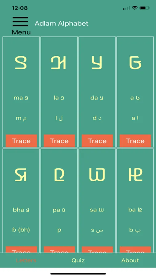 This app can help you get to know the ADLaM alphabet. Scroll through the letters and study their shapes and sounds. Practice tracing each one until you're familiar-- then quiz yourself on the letters!