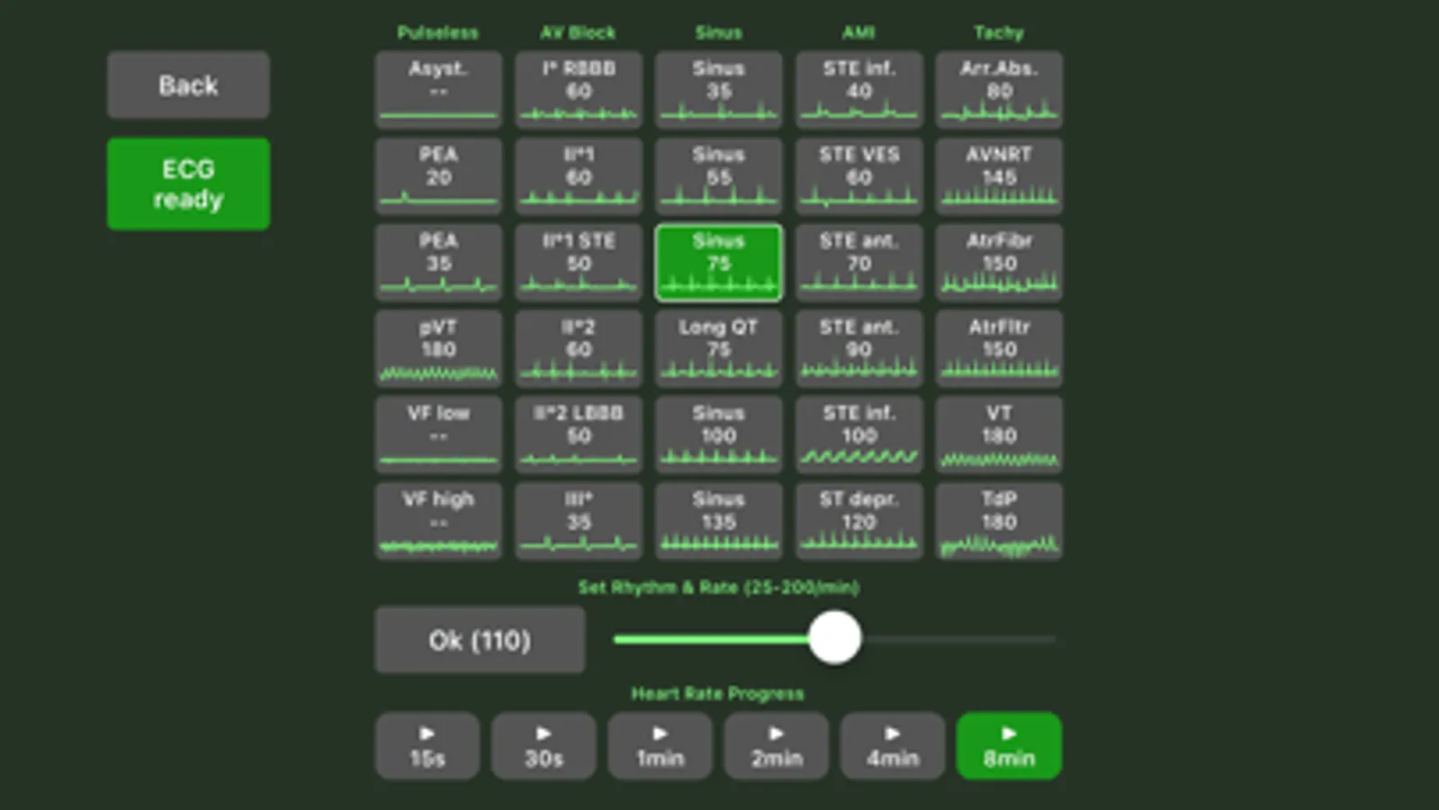 • 30 Realtime ECG Rhythms (I, II, III, aVR, aVL, aVF), variable frequency