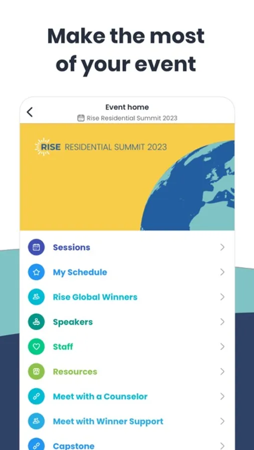 The RRS 2023 app is designed to help Rise Global Winners have a safe and fruitful experience at the Rise Residential Summit. It includes programming agenda, event logistics, bios of winners and speakers, emergency contact, and general support information.