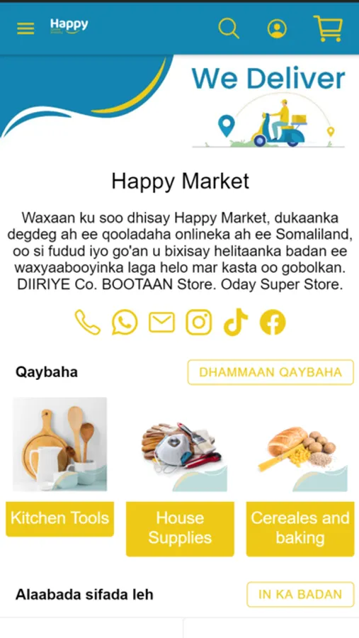 Whether you're stocking up on household essentials, planning a special meal, or simply need to replenish your pantry, Happy Market has got you covered. Our diverse product range spans across various categories, catering to your unique preferences and dietary requirements. We also feature local products to support the economy and promote sustainability in Somaliland.