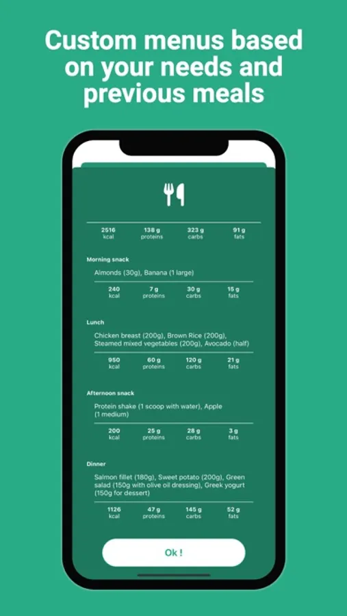 - Personalized Menus: Enjoy meal suggestions that consider not just your goals and nutritional needs, but also what you've consumed during the day. Balanced eating has never been this easy.
