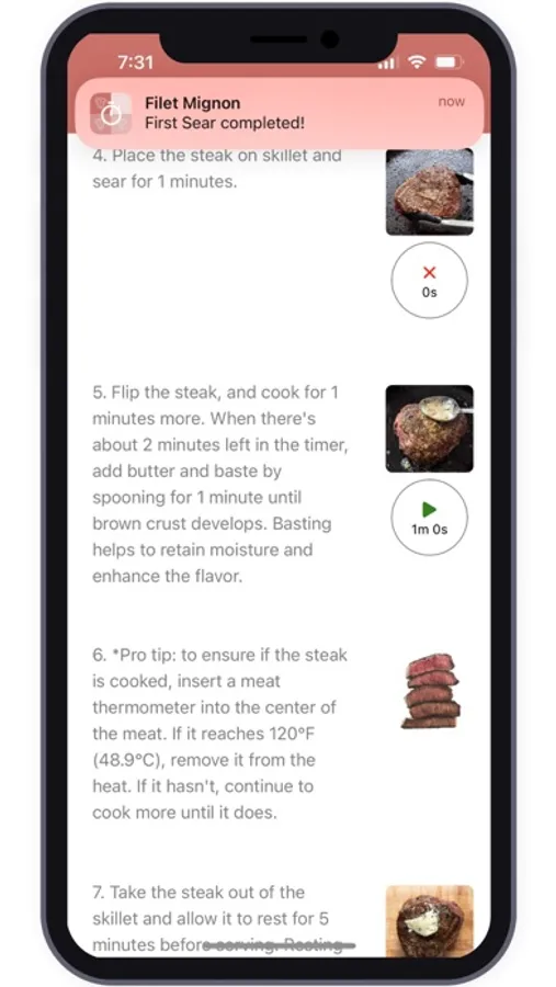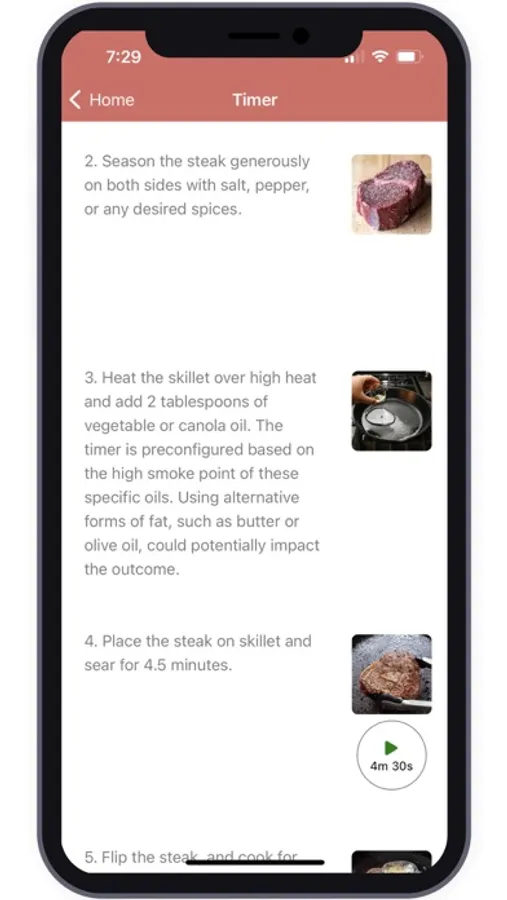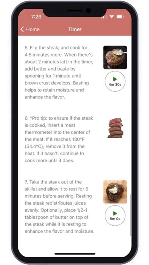 The app's detailed instructions make cooking steaks a breeze. Each step is accompanied by precise directions and corresponding images, ensuring you achieve the perfect sear, temperature, and doneness every time. For instructions that require precise timing, reusable timers are included, eliminating any guesswork. Whether you're searing, resting, or finishing off in the oven, this app has got you covered.