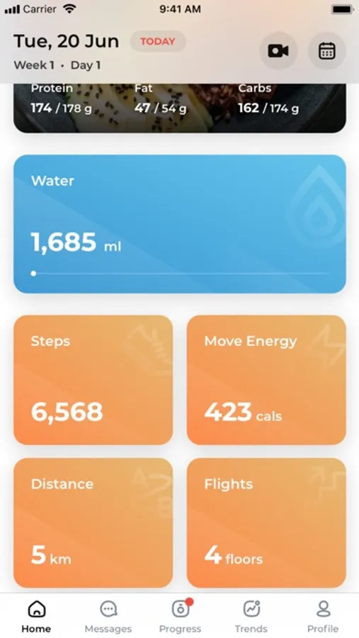 The app integrates with Apple Health to show your daily activity - distance, steps, active energy, and flights to help you better achieve your goals.