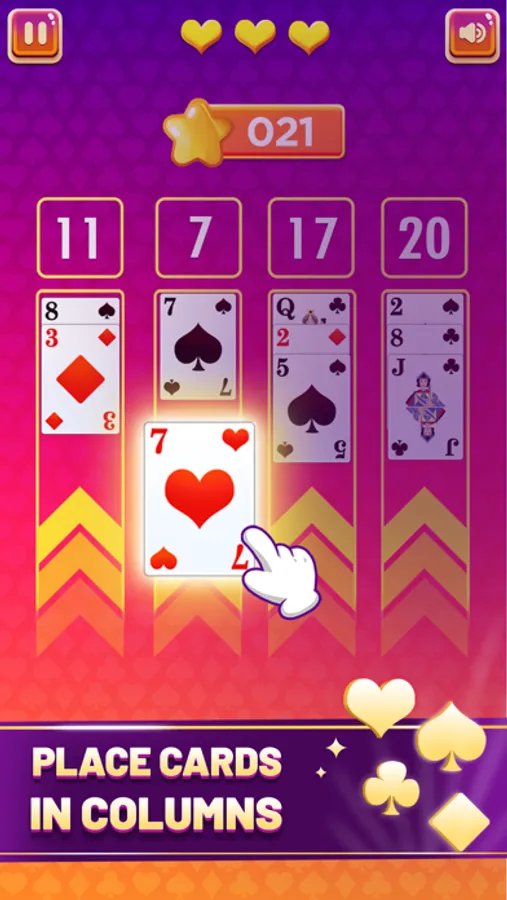 The game has four columns where the player needs to place the cards in order to make 21 points. That is why its name is 'Cards 21'. You get three lives in the game to make as much score as you can. However, you can use a maximum of 5 cards only in order to make a 21 score otherwise you will lose a life. You can also lose if the grand total of the cards becomes more than 21. If the player wins or loses, in both cases, the column will be cleared automatically.