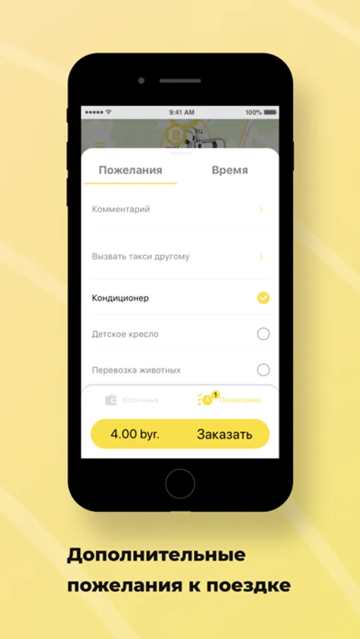 Добавьте к заказу дополнительные пожелания. Например, когда на улице +35 — выберите "кондиционер". Если вы не переносите запах табака — укажите "Некурящий салон", и к вам приедет некурящий водитель.