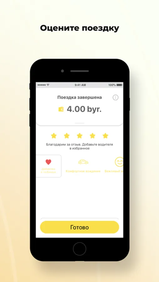 Поставьте оценку водителю, напишите отзыв или выберите реакцию из готовых шаблонов. Оставьте чаевые или посмотрите детализацию платежей после поездки.