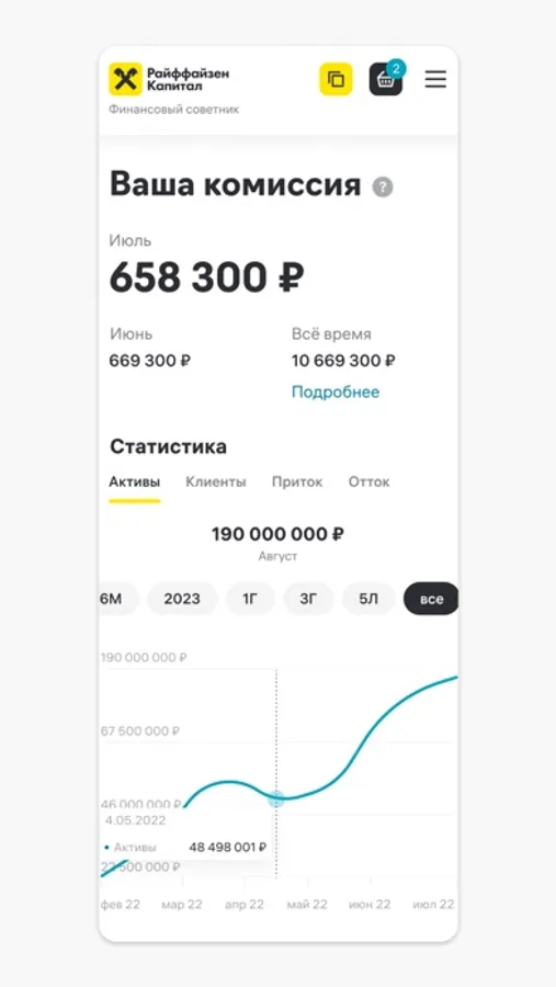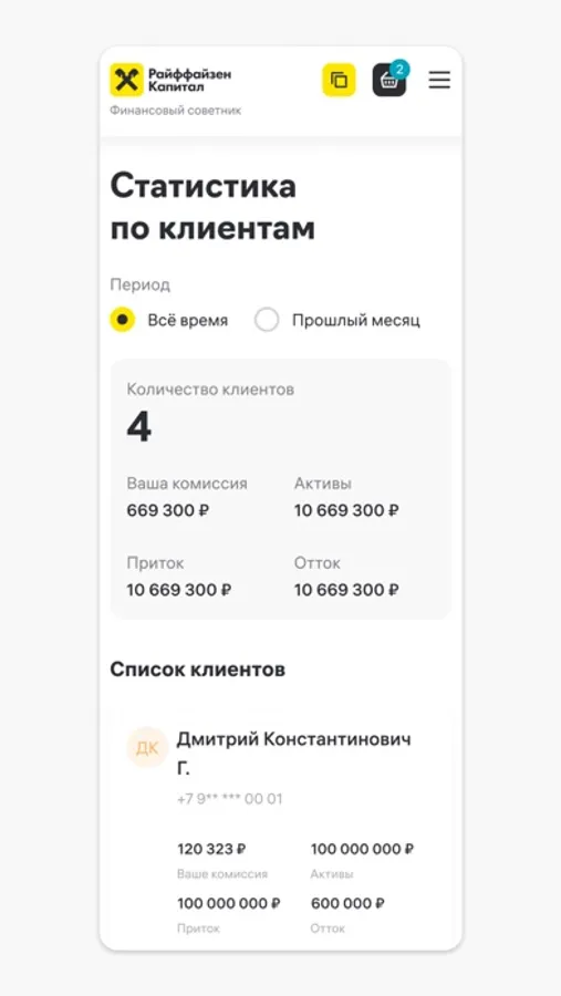 — Наблюдайте за своей статистикой: количеством клиентов и объемом их активов, а также притоками и оттоками активов.