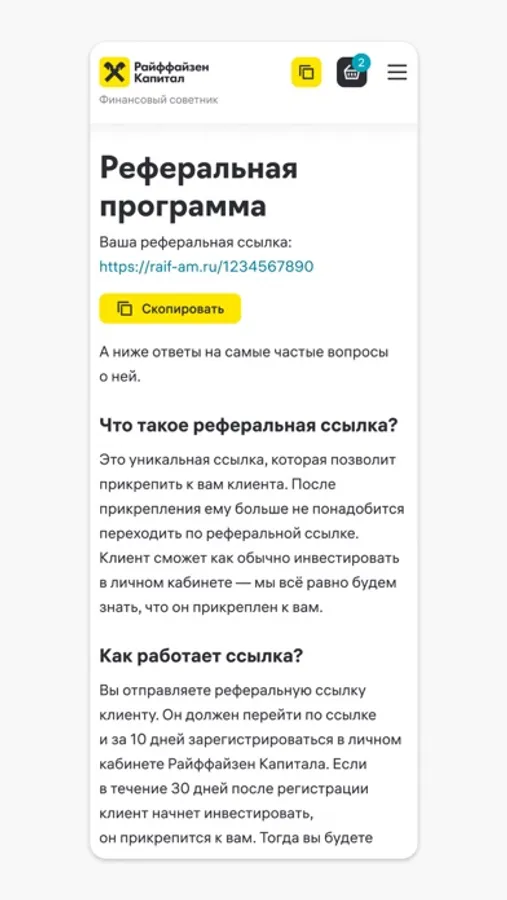 — Отправляйте клиентам вашу реферальную ссылку — с помощью нее клиенты закрепятся за вами и вы будете видеть их инвестиции в фонды и стратегии Райффайзен Капитала. Подробное описание реферальной программы есть в приложении.