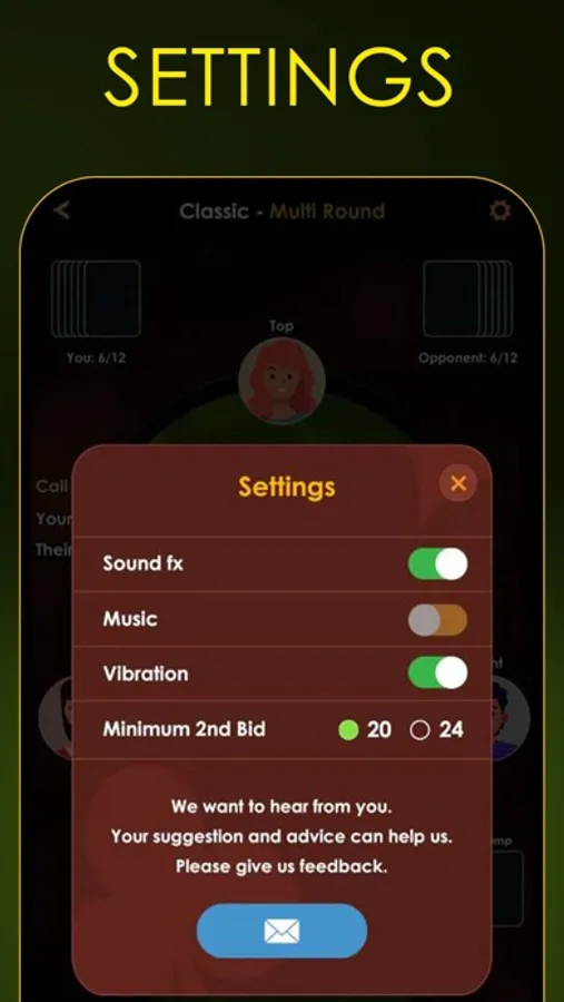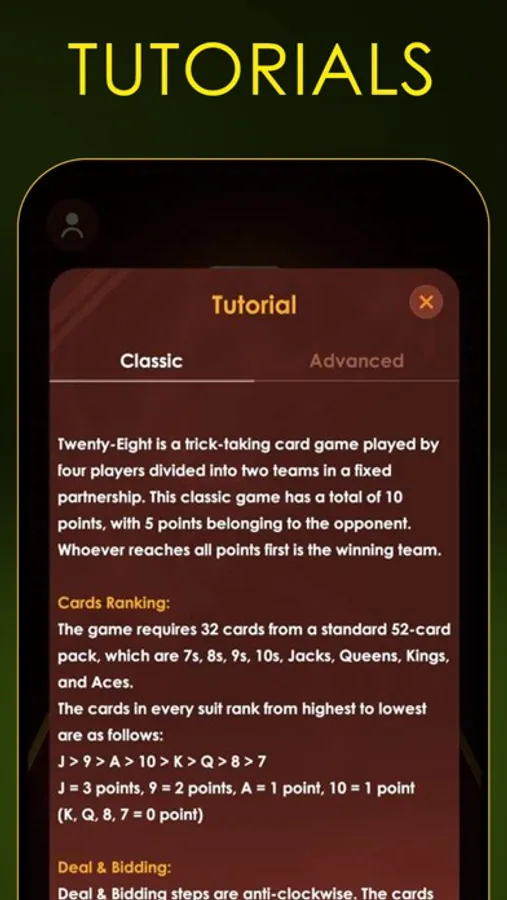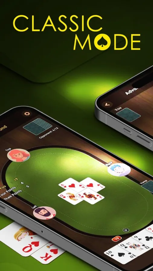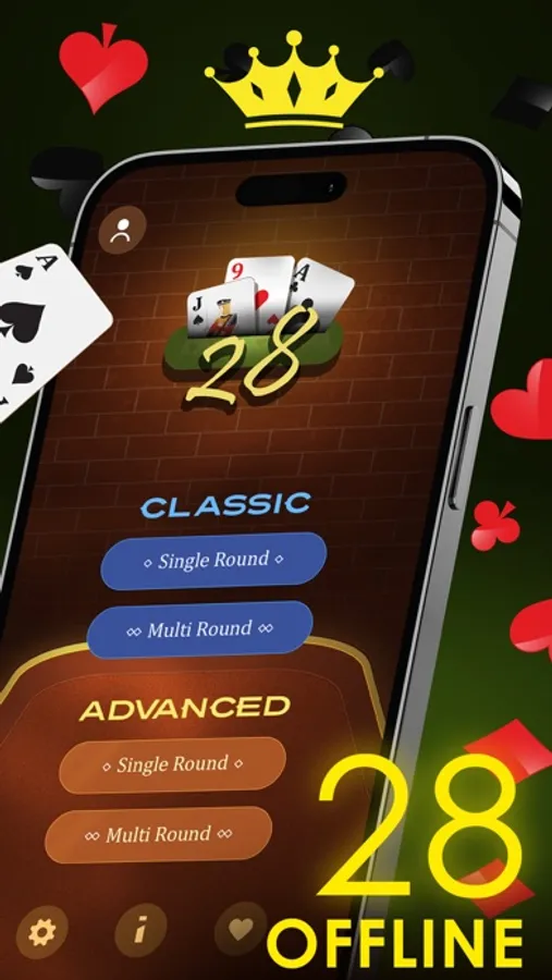 The Twenty-Eight Card game is an exciting and challenging trick-taking card game that involves two teams of four players each. It uses only 32 cards from a standard deck and is popular in South Asia. You need to be smart, attentive, and good at remembering cards to win this game. You can play this game Offline in two modes: classic and advanced. Each mode has a single-round and a multi-round option.
