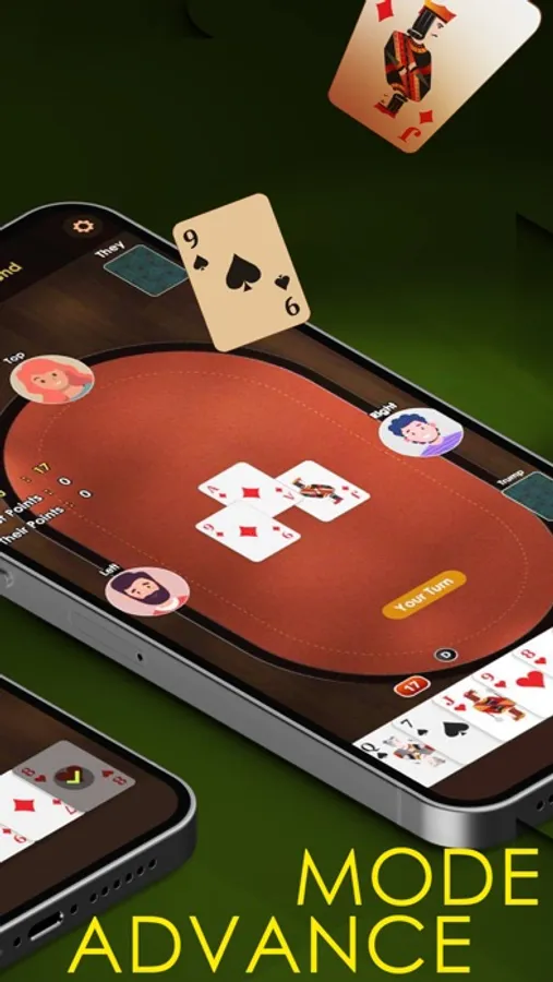 The cards and points are the same as Classic mode. The difference is in the bidding. Players get four cards and bid 14 to 28. The winner picks a trump suit with four cards.