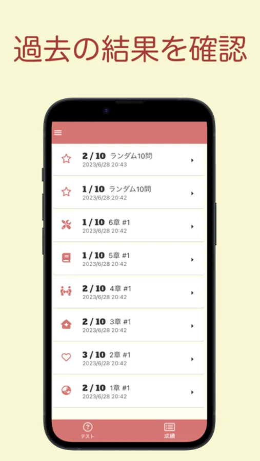 実施した問題については履歴から確認し、間違った問題を復習できます。