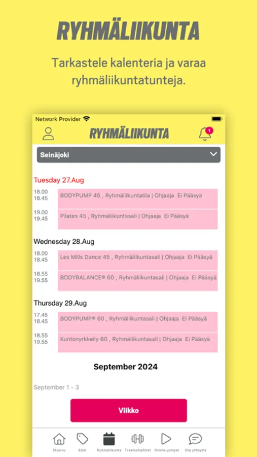Tarkastele kalenteria ja varaa ryhmäliikuntatunteja. Sovelluksella voit myös hallinnoida tekemiäsi tuntivarauksia.