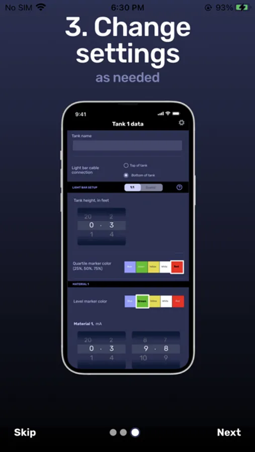 Offering an extensive set of features, this app supports two types of materials per container, with the ability to set individual colors for each material's level marker, and on/off options for monitoring. High and low-level warnings can be customised according to percentage, color, and toggled on or off.