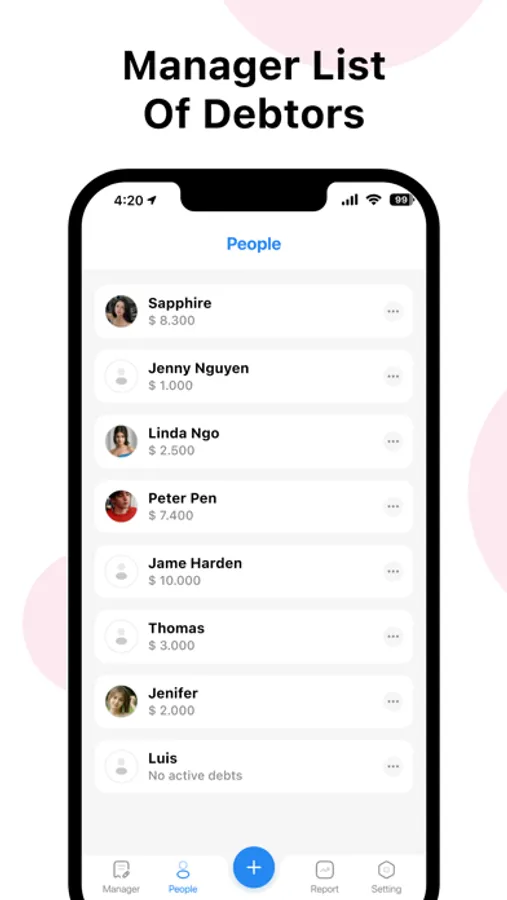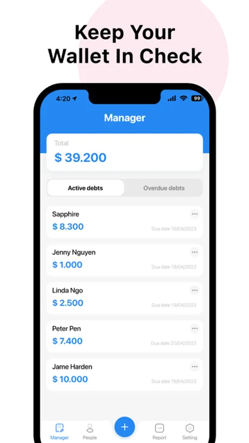 - People: Users can manage the debtor's contact list and the total amount that the debtor owes. In addition, you can go to the debt details and view the debt payment history of the debtor