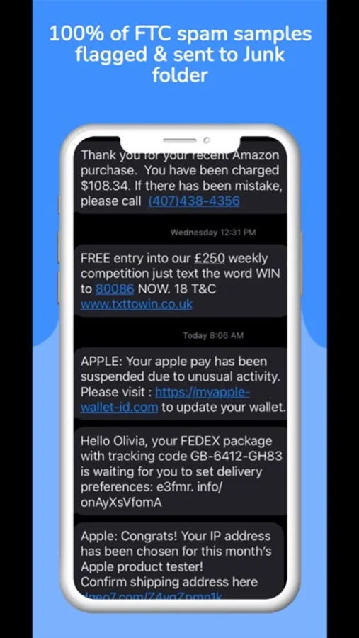 Text Spam Arrest uses an AI engine to detect spam. It has been trained on the entire English vocabulary. And also has seen every type of scam on the internet. These capabilities cover all the major sources of intrusion in your Messages inbox. These include the following 5 areas flagged by the FTC as the top ones of 2022: