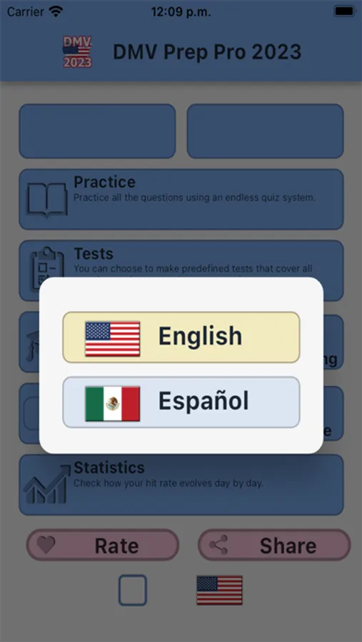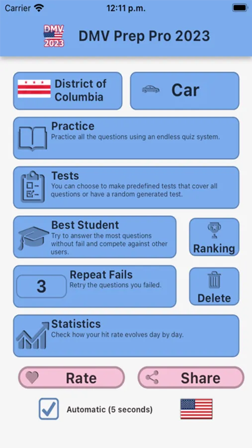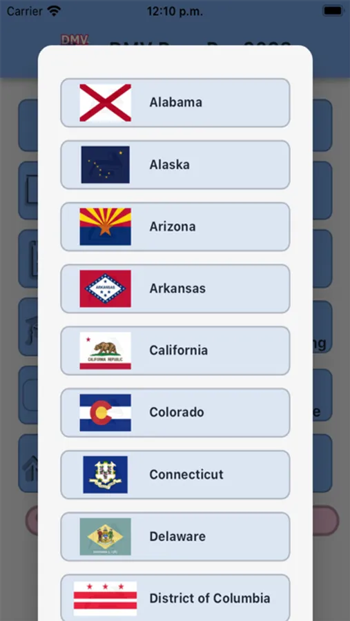When you first open DMV Prep Pro, you'll be prompted to select your state and the type of exam you're preparing for. From there, you'll be taken to a dashboard that displays all the different sections included in the app.