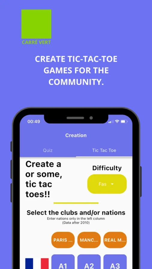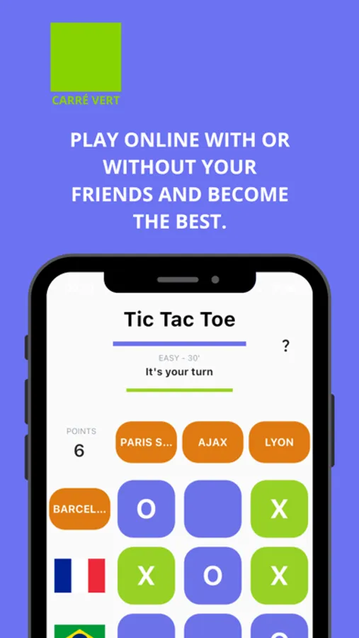 Ready to discover a whole new level of entertainment? I've created Carré V, a unique and exciting gaming experience! I designed an online Football Tic Tac Toe game and a Football Quiz that reinvents the way you play with your friends.