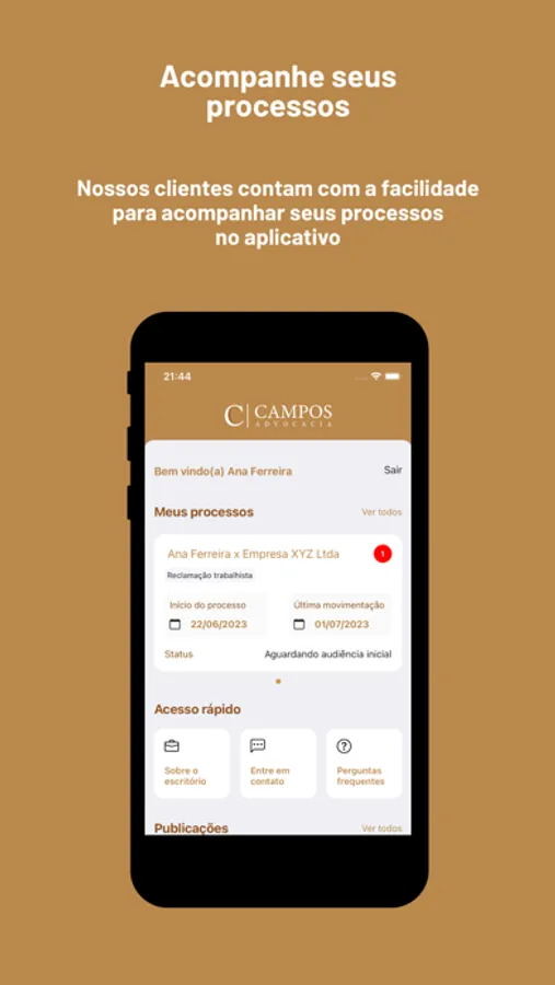 O aplicativo do nosso escritório de advocacia é a solução ideal para quem busca agilidade e praticidade no acompanhamento dos seus processos. Com o nosso app, os clientes têm acesso fácil e rápido aos andamentos dos seus casos, de forma simples e intuitiva. Agora, você pode ficar por dentro de todas as atualizações, sem precisar sair de casa ou do escritório. Baixe agora mesmo e comece a desfrutar dos benefícios que a tecnologia pode trazer para a sua vida.