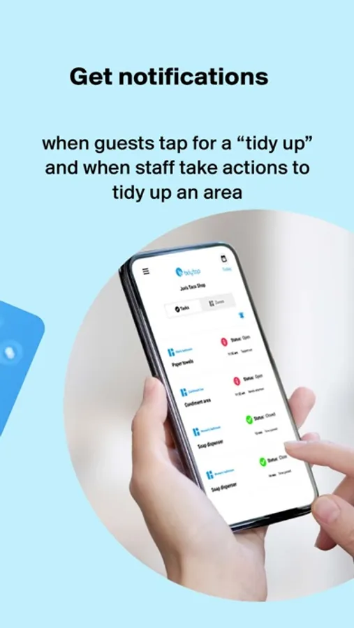 Meet Tidy Tap, the most flexible tap-to-notify solution to help keep your retail operations running smoothly. Dirty restroom? Is your soap dispenser empty or have your paper towels out? It’s hard to make sure those areas tucked at your restaurant, hotel, store, or shared workspace are always clean and items are stocked. Add a Tidy Tap Bluetooth sensor to any area or item you’d like to monitor. If the area needs to be tidied up, anyone can tap the sensor twice and notify the appropriate staff. Or you can assign a Tidy Tap Bluetooth sensor to any item that might need regular refills like a soap dispenser, paper towel dispenser, or even the office printer! When the item is empty, anyone can tap the Bluetooth sensor twice to send a notification. Tidy Tap is also a great tool for regular check-ins, like rounding, travel paths, safety walks, and more. Strategically place Tidy Tap’s Bluetooth sensors in areas you want checked at regular time intervals. Whoever is supposed to check-in, simply taps the Bluetooth sensor twice to let you know they performed the task. If you want to take it a step further, you can customize a sensor and assign it to any task. If activated, it will send a notification to the right person. The Tidy Tap app works with Tidy Tap hardware. A WiFi hub connects to the Bluetooth sensors, which sends the notification data to the cloud and to your app. Simply clear the notification after you have fixed the issue.