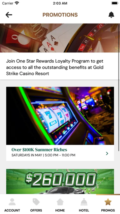Experience the new gold standard with the Gold Strike Casino Resort app: the must-have, most convenient way to make your experience even more rewarding! One Star Rewards members can now check their point balance, progress to the next tier level, bonus points, and more. Be the first to know all upcoming property promotions and events, and enjoy exclusive in-app offers for dining, hotel, & other amenities.