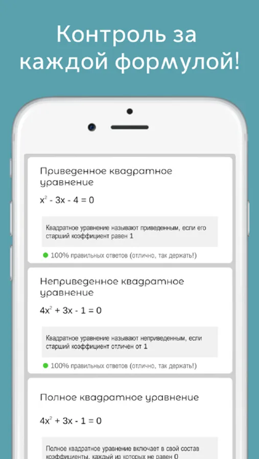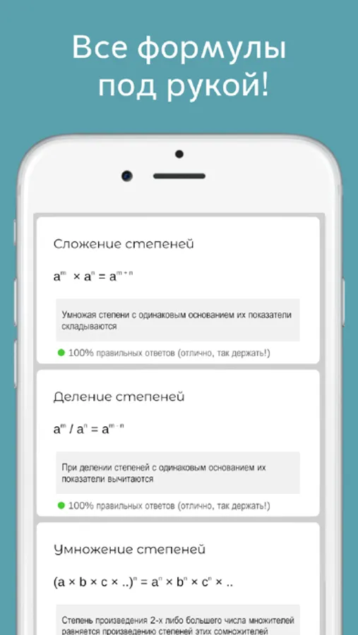 Формулы по алгебре также подойдут для ОГЭ и ЕГЭ, под каждой формулой есть подробное описание, то есть подписана каждая буква, а также процент и цветовой индикатор того, как хорошо вы знаете ту или иную формулу.