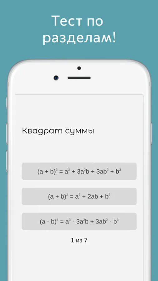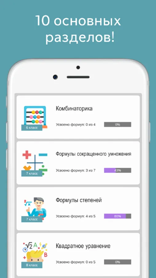 Привет, дорогой друг! Все очень просто – абсолютно все формулы по алгебре разбиты на 10 разделов, выбери нужный, изучи формулы и пройди короткий итоговый тест по всему разделу!