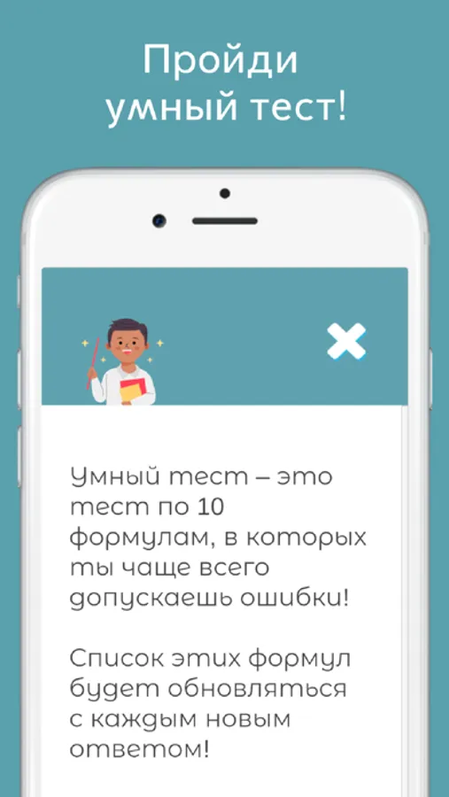 Также у нас есть уникальная функция – "Умный тест", – это тест по 10 формулам в которых ты чаще всего допускаешь ошибки! По мере ответов этот список будет обновляться.