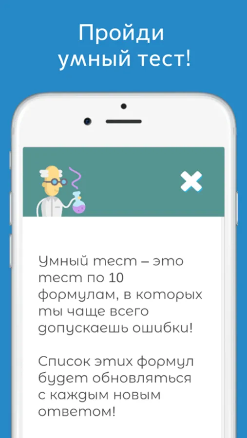 Также у нас есть уникальная функция – "Умный тест", – это тест по 10 формулам в которых ты чаще всего допускаешь ошибки! По мере ответов этот список будет обновляться.