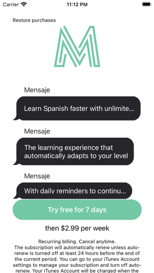 In order to use Mensaje, you must subscribe. After the free-trial period, payment will be charged to your Apple account, and your account will be charged for renewal within 24-hours prior to the end of the current period. Auto-renewal may be turned off at any time by going to your settings in the App Store after purchase. Any unused portion of a free trial period, if offered, will be forfeited when the user purchases a subscription to that publication, where applicable.