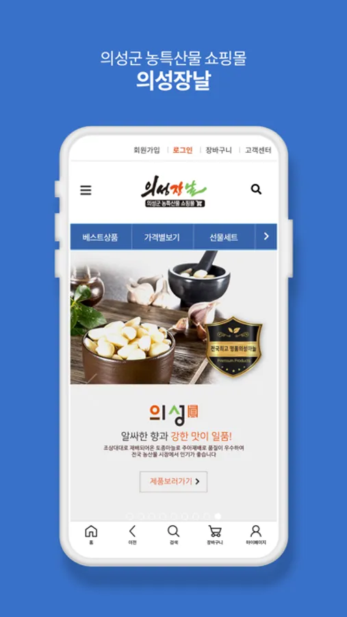 의성장날은 의성군의 대표적인 신선농산물과 다양한 특산물을 직거래로 저렴하게 만나보실 수 있는 쇼핑몰입니다. 마늘, 사과, 자두, 복숭아 등 다양한 농특산물을 홈페이지 또는 앱에서 간편하게 구매하세요.