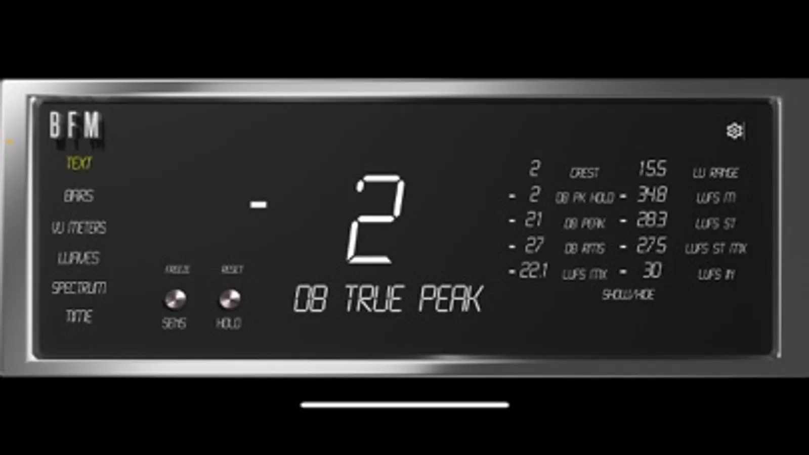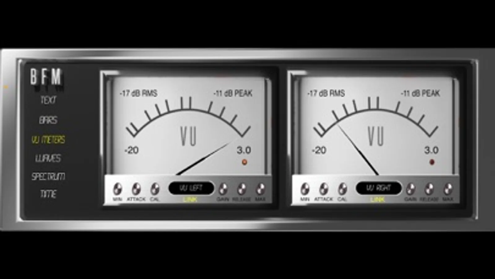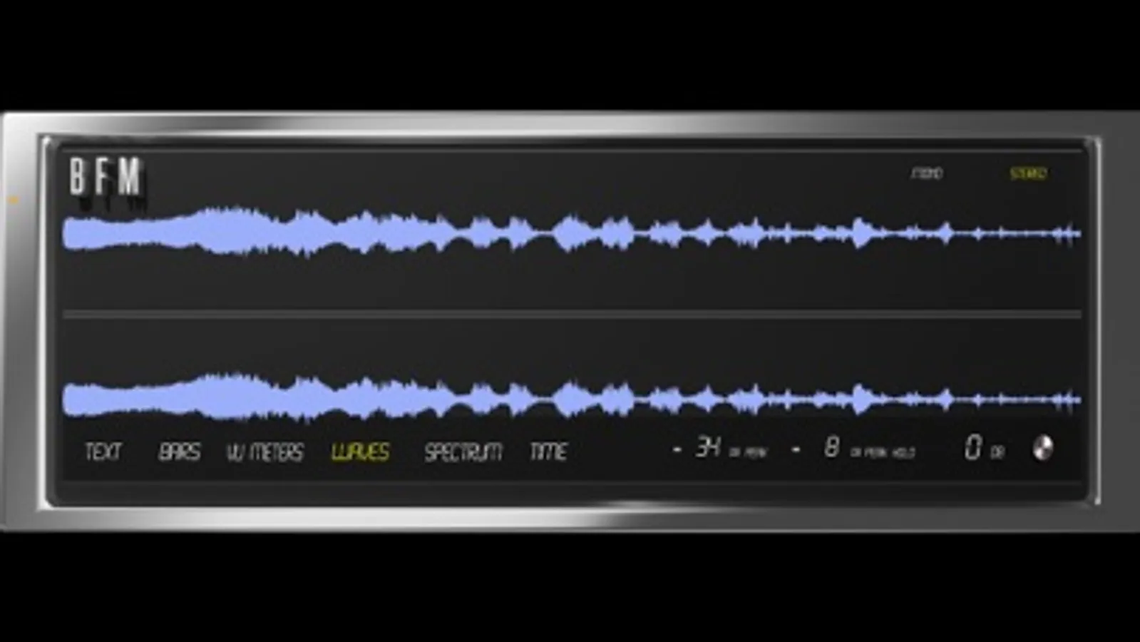 BFM currently offers 6 Modes with RMS, LUFs, Peak, and Peak Hold values, to give you a variety of views to keep your signal under control. The Text, Bars, Waves, VU Meters, Spectrum, & Time let you decide how you want to keep track of your signal with multiple fonts/formats to view them in.