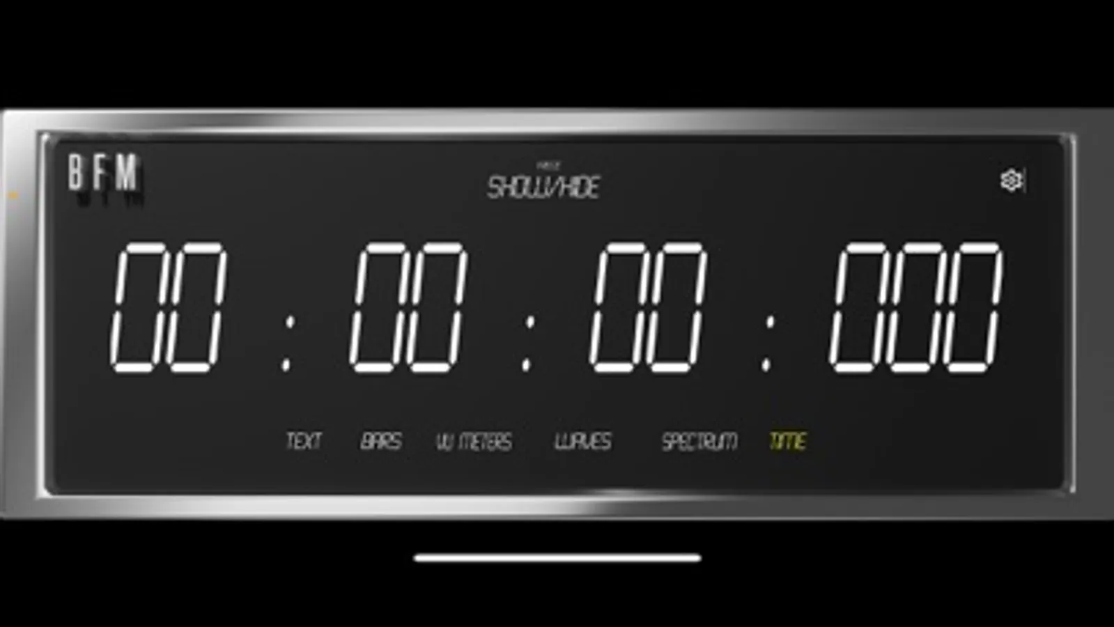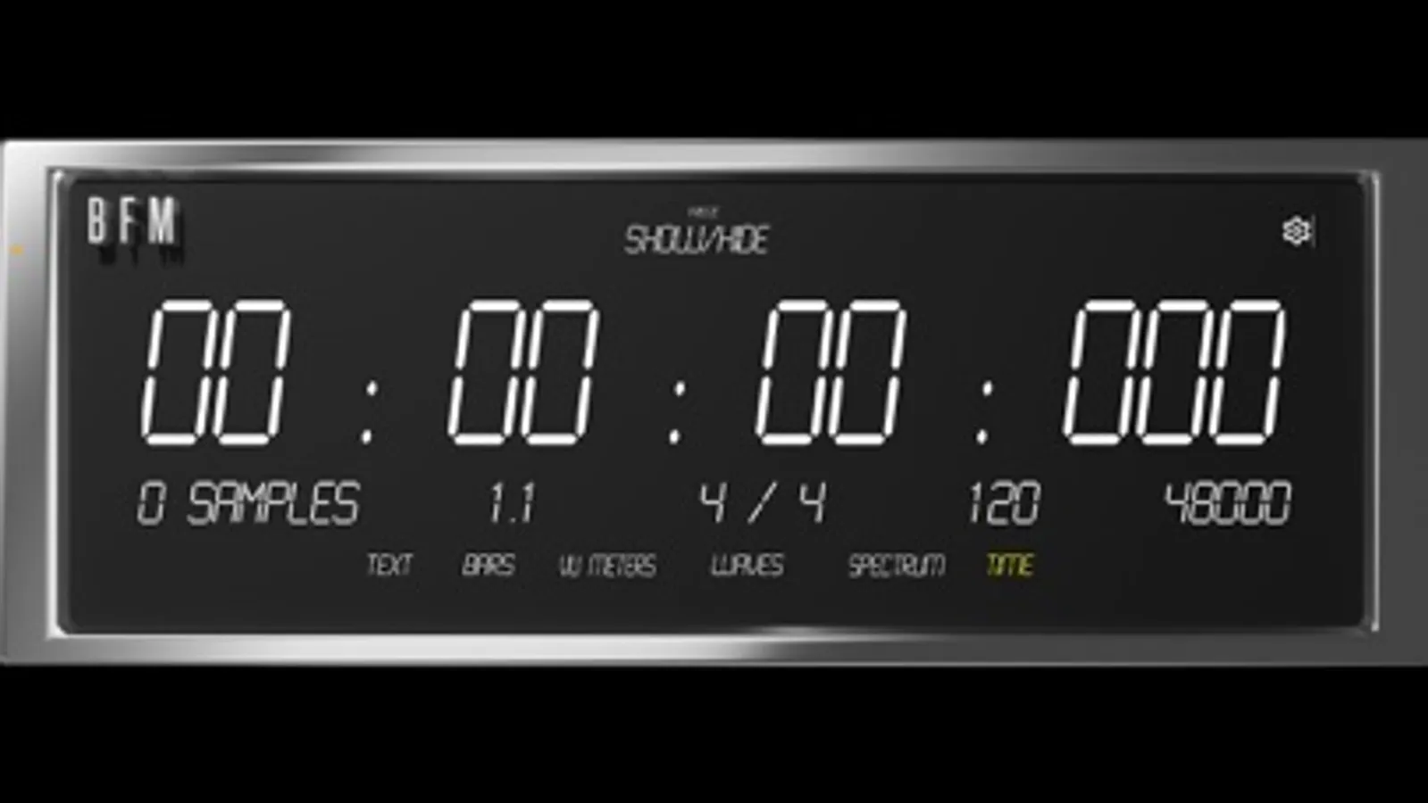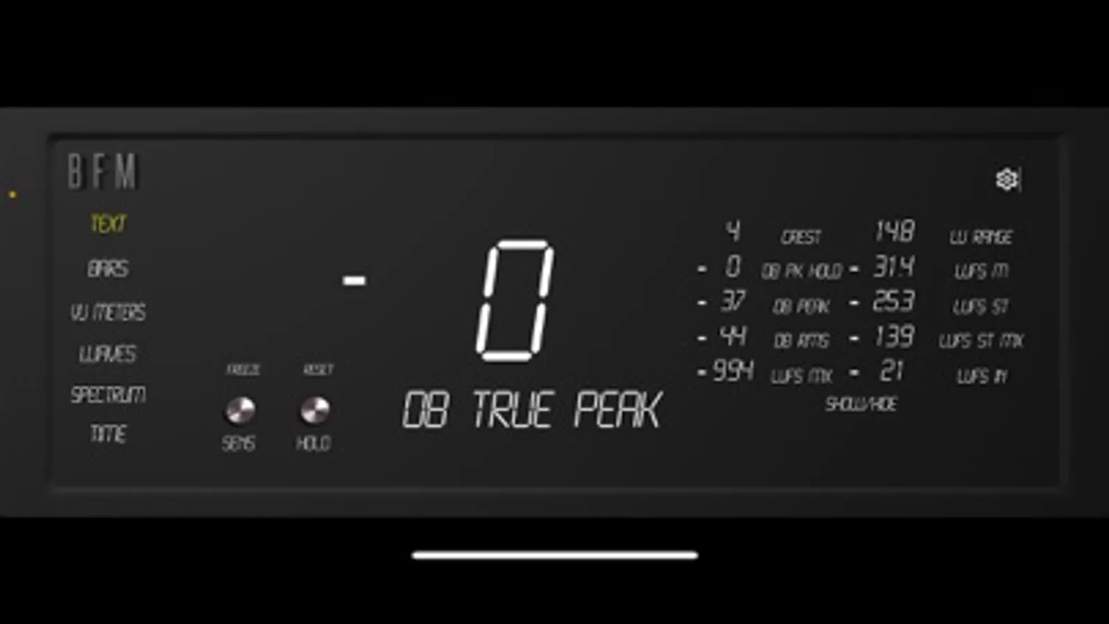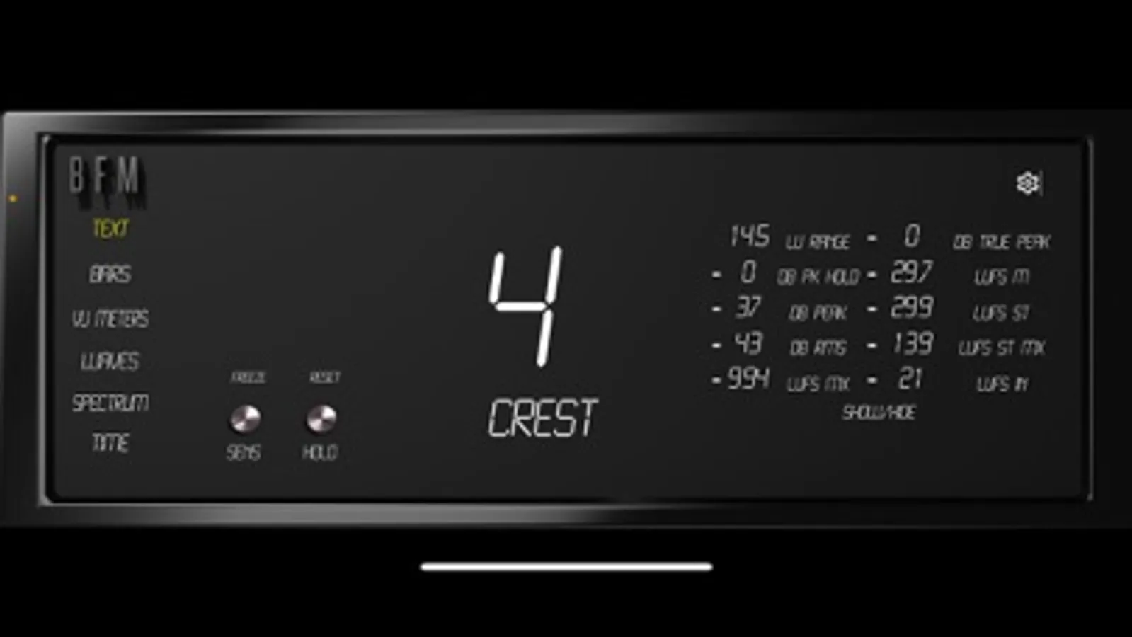 BFM currently offers 6 Modes with RMS, LUFs, Peak, and Peak Hold values, to give you a variety of views to keep your signal under control. The Text, Bars, Waves, VU Meters, Spectrum, & Time let you decide how you want to keep track of your signal with multiple fonts/formats to view them in.