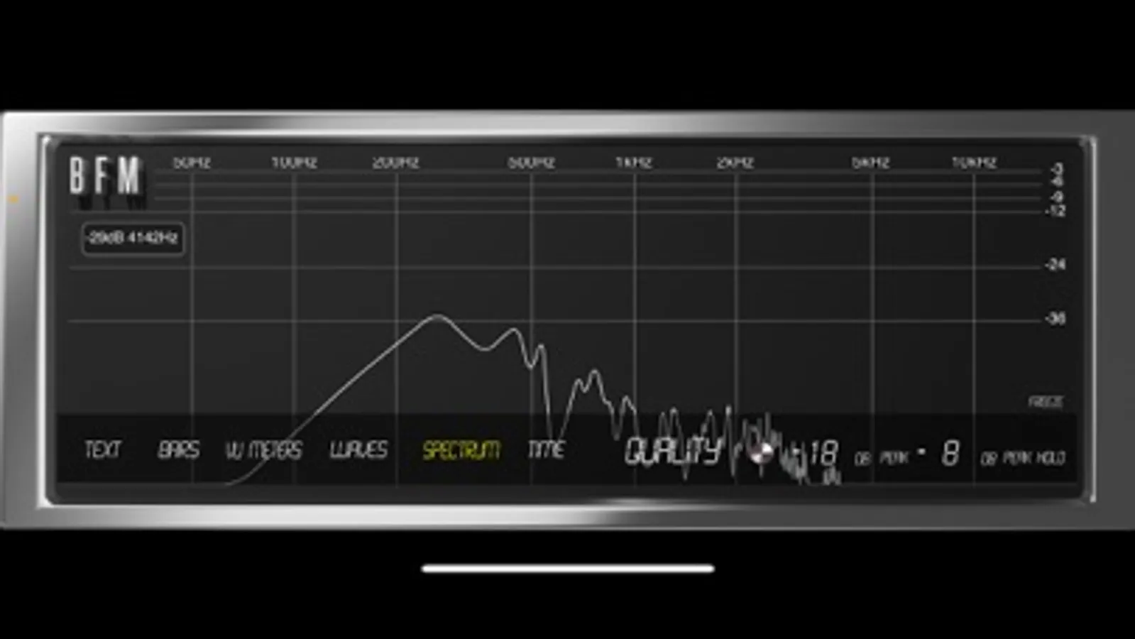 Spectrum is a simplified frequency spectrum view with 3 quality modes. Great for getting an overall look at where your frequencies are when mixing or editing. Tap to freeze and inspect. There is also the PEAK value displayed on this page. To reset Peak Hold click the value.