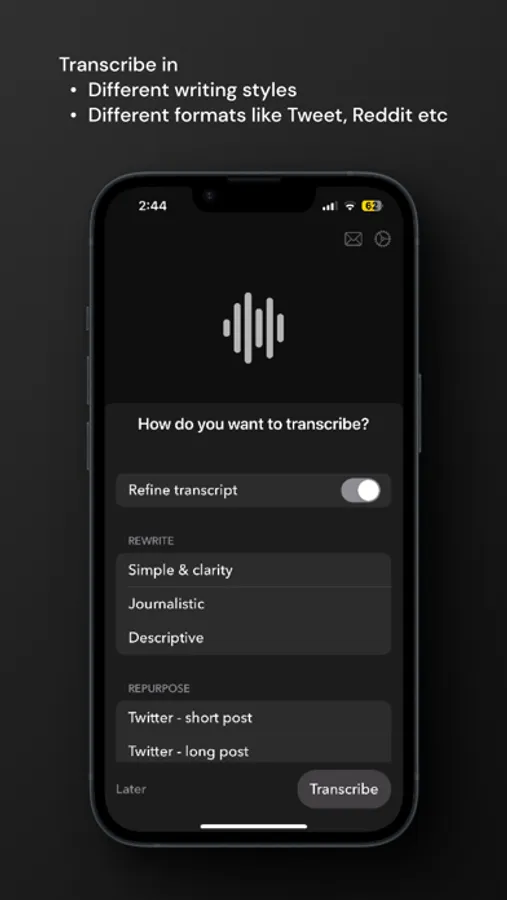 Just record your free flow random thoughts, we make them clarity in writing. We don't just stop there, we help you take your thought and create different types of content around it.