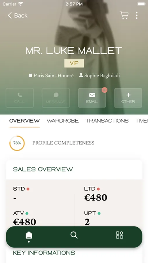 - Client 360: Accès a l'ensemble des données qui composent la fiche client, les données de contact, l'historique d'achat, l'historique de contacts, le vestiaire, ...