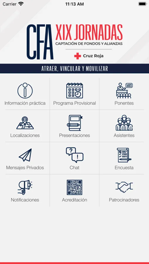 Además esta APP será de utilidad para participar activamente durante las Jornadas conectando con asistentes, intercambiando mensajes privados, publicando tus opiniones, compartiendo tus fotos... ¡Descubre todas sus posibilidades y no pierdas detalle de todo lo que pasa en las Jornadas de Captación de Fondos y Alianzas con Empresas de Cruz Roja de 2023. ¡Te esperamos!