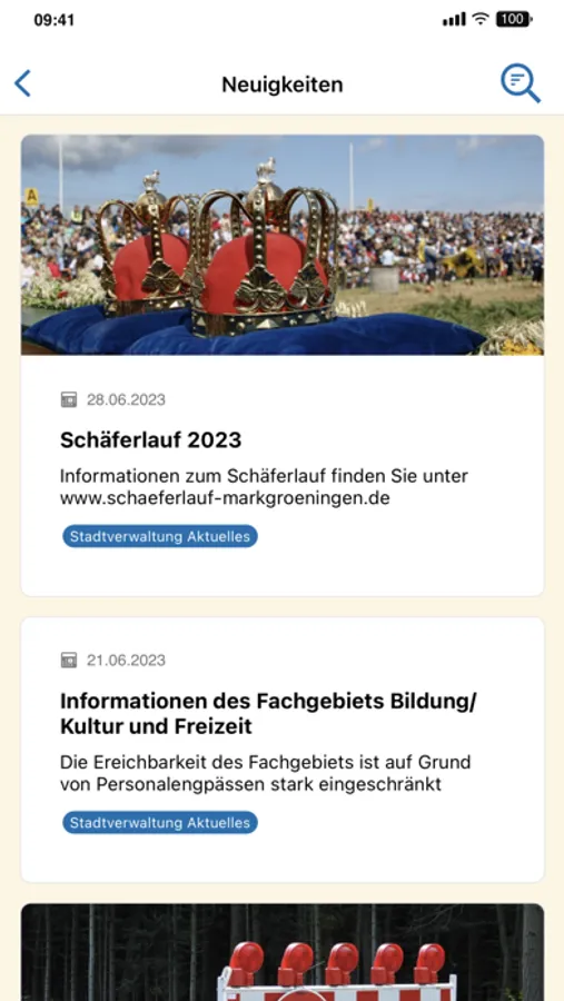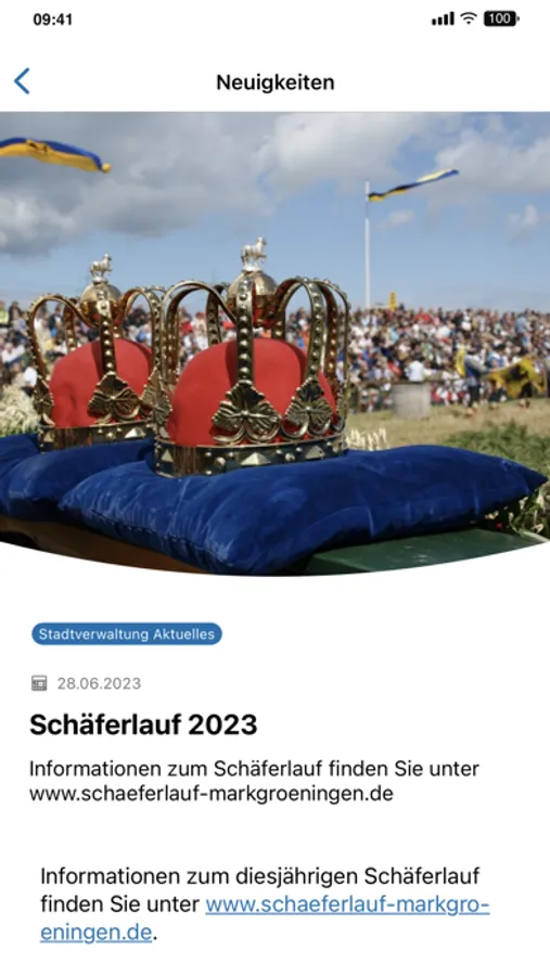 Mit dieser App erhalten Sie einen schnellen und einfachen Zugriff auf aktuelle Meldungen der Stadt Markgröningen . Darüber hinaus können Sie sich über Veranstaltungen und andere Termine informieren und diese direkt in Ihren eigenen Kalender übernehmen. Informationen aus dem Rathaus erhalten Sie mittels Push-Nachrichten, deren Empfang Sie über die Auswahl einzelner Kategorien selbst steuern können. Bleiben Sie stets up to date – mit Ihrer Markgröningen-App.