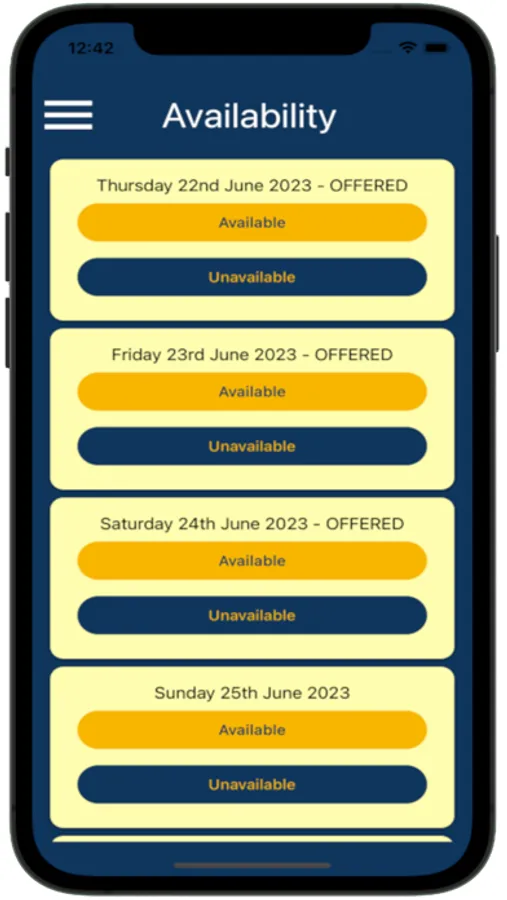 Manage your work schedule with ease using our app. Stay in control of your shifts and availability with our intuitive shift management system. Accept or reject shifts with a simple tap, ensuring flexibility and convenience for your busy lifestyle. Add and update your availability with a simple tap of a button, receive notifications when you have new shifts pending confirmation, keep your personal details up to date, query shifts..
