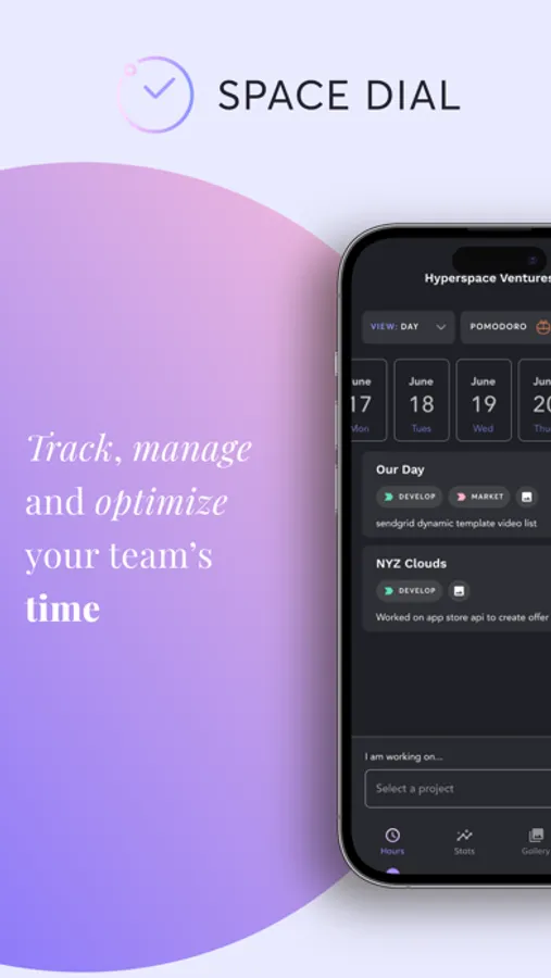 Track, manage, and optimize your team’s time - with Space Dial’s mobile app, your team can now improve their productivity anytime, anywhere. Use the Pomodoro tracker to increase your focus, and check out your personal analytics dashboard to see how you spend your time and improve performance. The to-do checklist makes it easy to turn your to-dos into log entries. Stay ahead of the curve and easily log your work hours with just a few clicks.