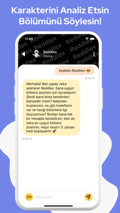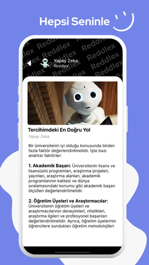 Yapay Zeka Reddlex, üniversite seçiminde size rehberlik eden kişisel bir asistanınızdır! Kendinizi anlatın ve tercihlerinizi paylaşın, Reddlex size en uygun üniversite bölümlerini önerecektir. Sizleri en iyi anlayan yapay zeka algoritmasıyla çalışan Reddlex, hedeflerinizi belirlemenize, yeteneklerinizi değerlendirmenize ve geleceğinizi şekillendirecek doğru kararı vermenize yardımcı olur. Reddlex ile üniversite seçimi kolay ve keyifli hale gelirken, hayallerinize bir adım daha yaklaşın!