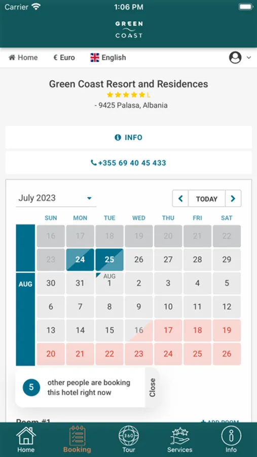 Shërbimet dhe aktivitetet: Shfletoni përvojat e mrekullueshme që Green Coast ka për t'ju ofruar. Informohuni për restorantet, pishinat, aktivitetet sportive, qendrat e shëndetit dhe të tjerët, të disponueshëm brenda kompleksit. Përdorni aplikacionin për të rezervuar shërbime shtesë dhe për të planifikuar aktivitete interesante në zonën përreth.