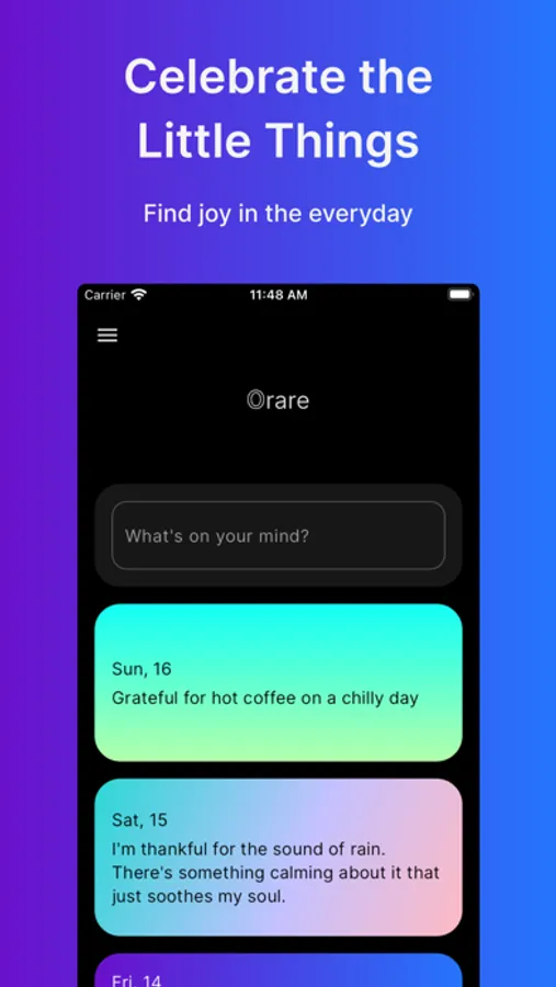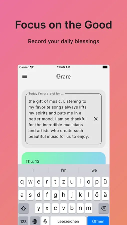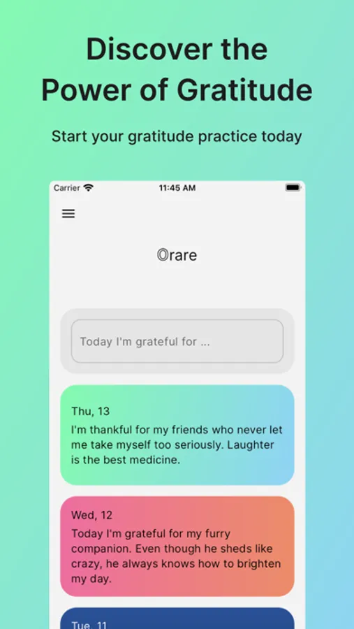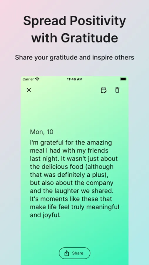 Our gratitude journaling app is the ultimate tool for anyone looking to improve their mental health and well-being. By focusing on the positive, you'll feel more relaxed and grateful in your daily life, and experience a greater sense of overall happiness and satisfaction. Plus, with all the sharing options, you can inspire others and spread positivity wherever you go.