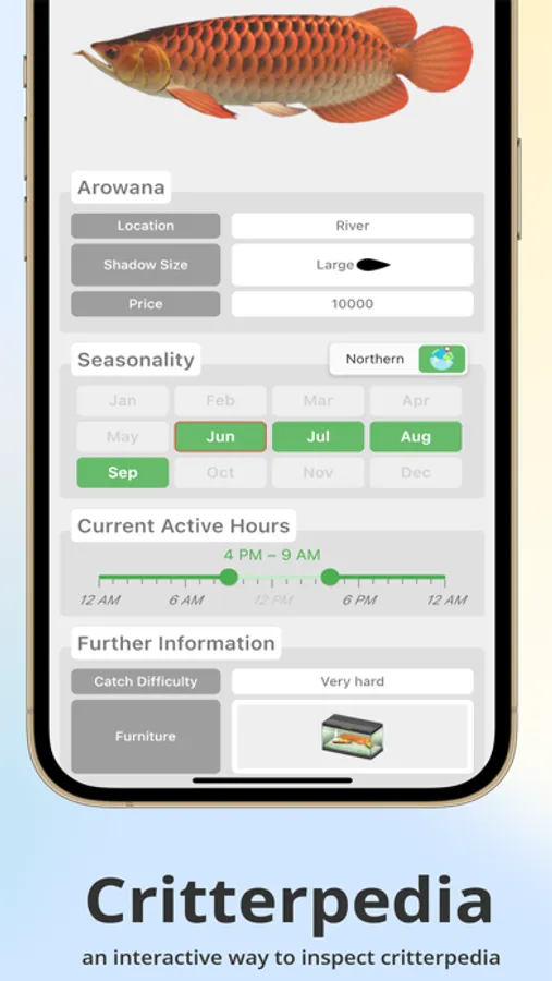 - Critter Tracker: Stay updated on the availability of fish, insects, and sea creatures in real time. Access detailed information such as active times, preferred weather conditions, pricing, and locations.