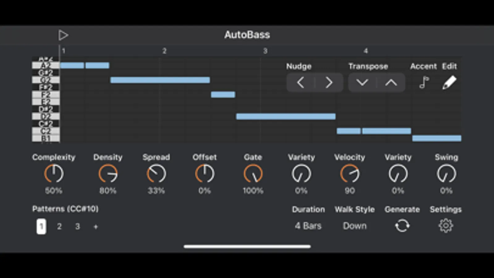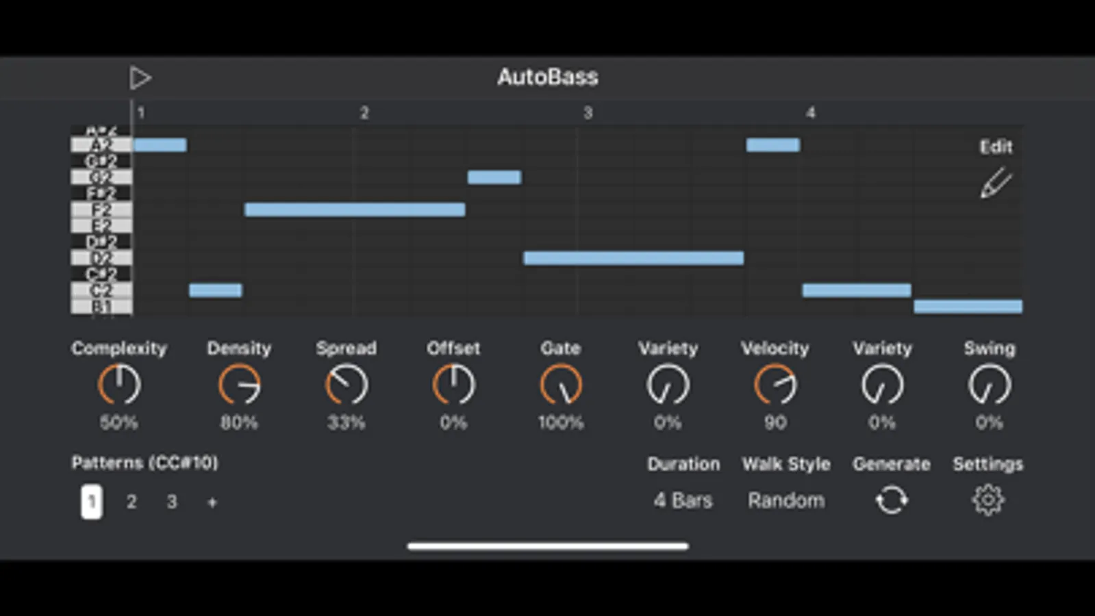 Auto Bass is a MIDI generator app with an editable algorithm. You can create basslines or melodies automagically with Auto Bass.