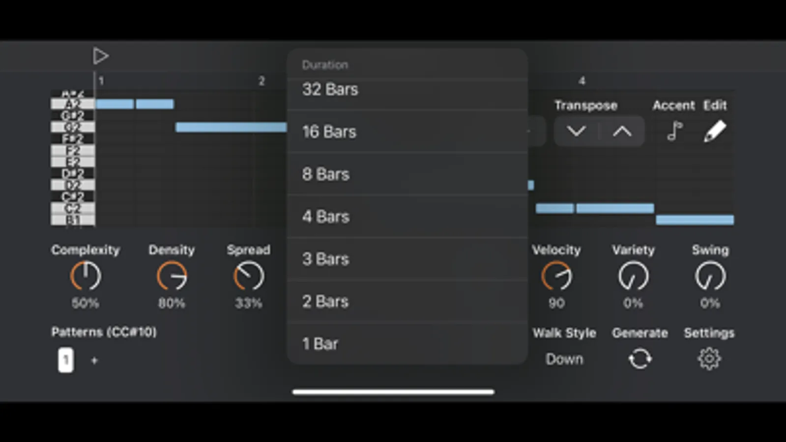 You can set your bassline pattern's duration with between 1-bar long to 64-bars long.