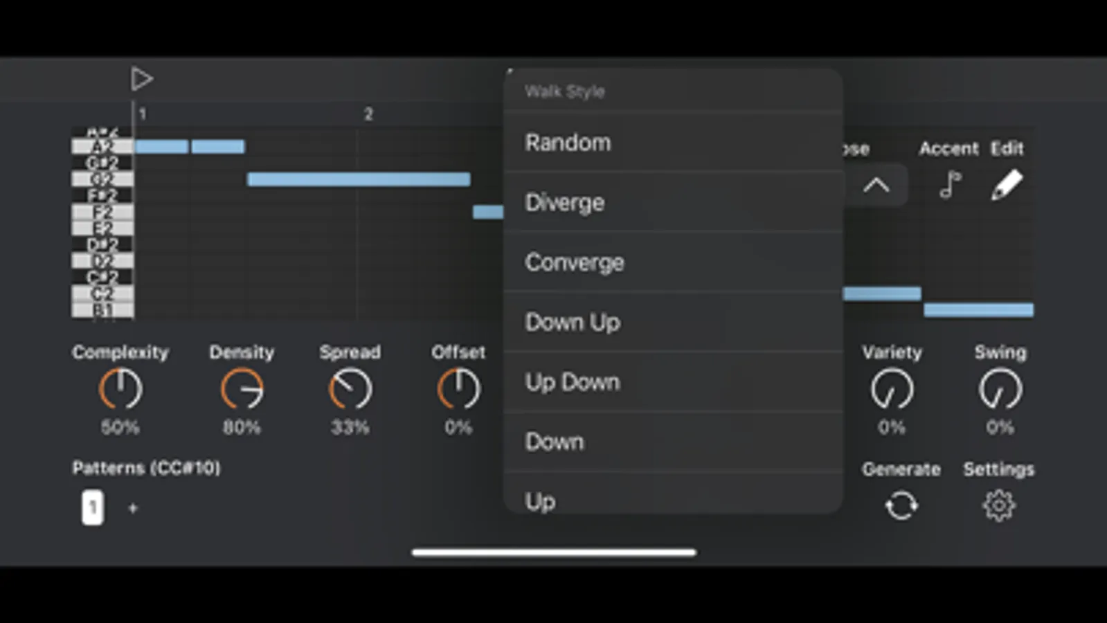 Walk type rearranges the notes on the piano roll without regenerating the whole sequence.